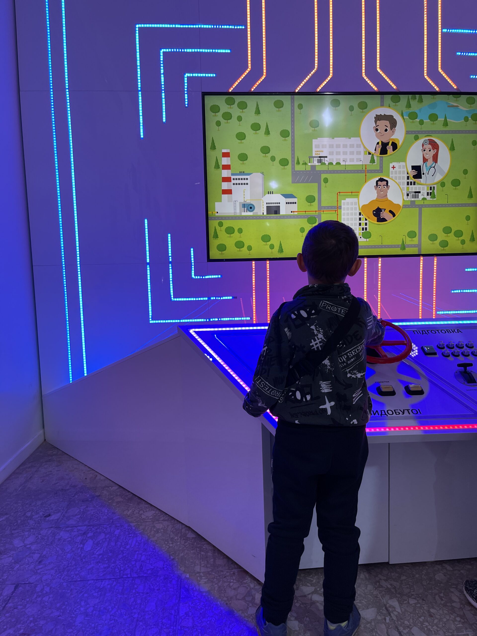 Великий екран, фізичні кнопки й повна імітація газовидобутку – від буріння свердловини до подачі газу у будинок. Дитина сама керує процесом: натискає кнопки, запускає механізми й спостерігає, як її дії впливають на те, що відбувається на екрані.